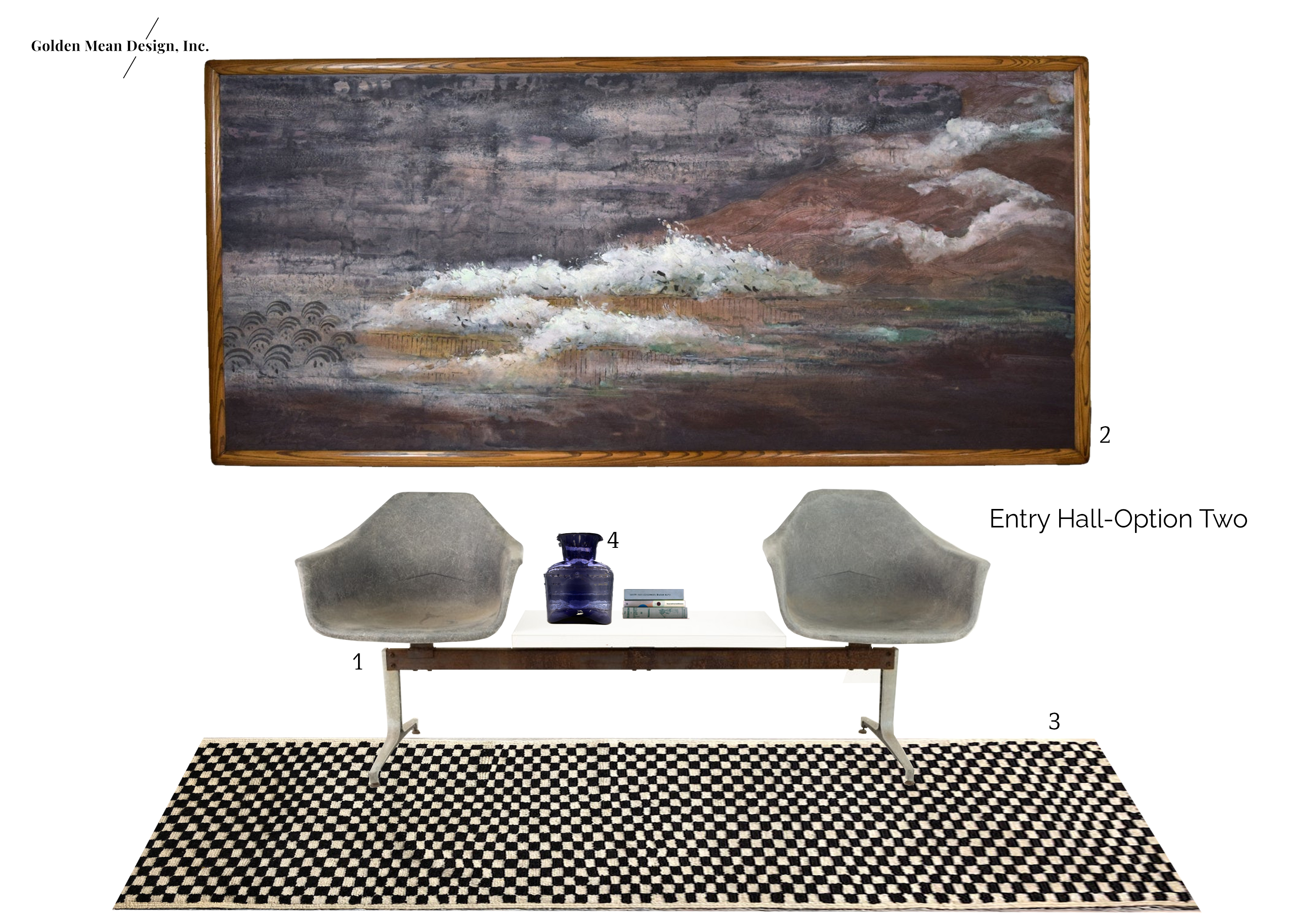 This second shoppable post in the entry hall series shows a more dramatic scheme, which would work best in a larger space, ideally with higher ceilings. The large-scale art dominates the space, and everything else is kept simple and minimalistic so that the art is the focus. Drama is the name of game here.