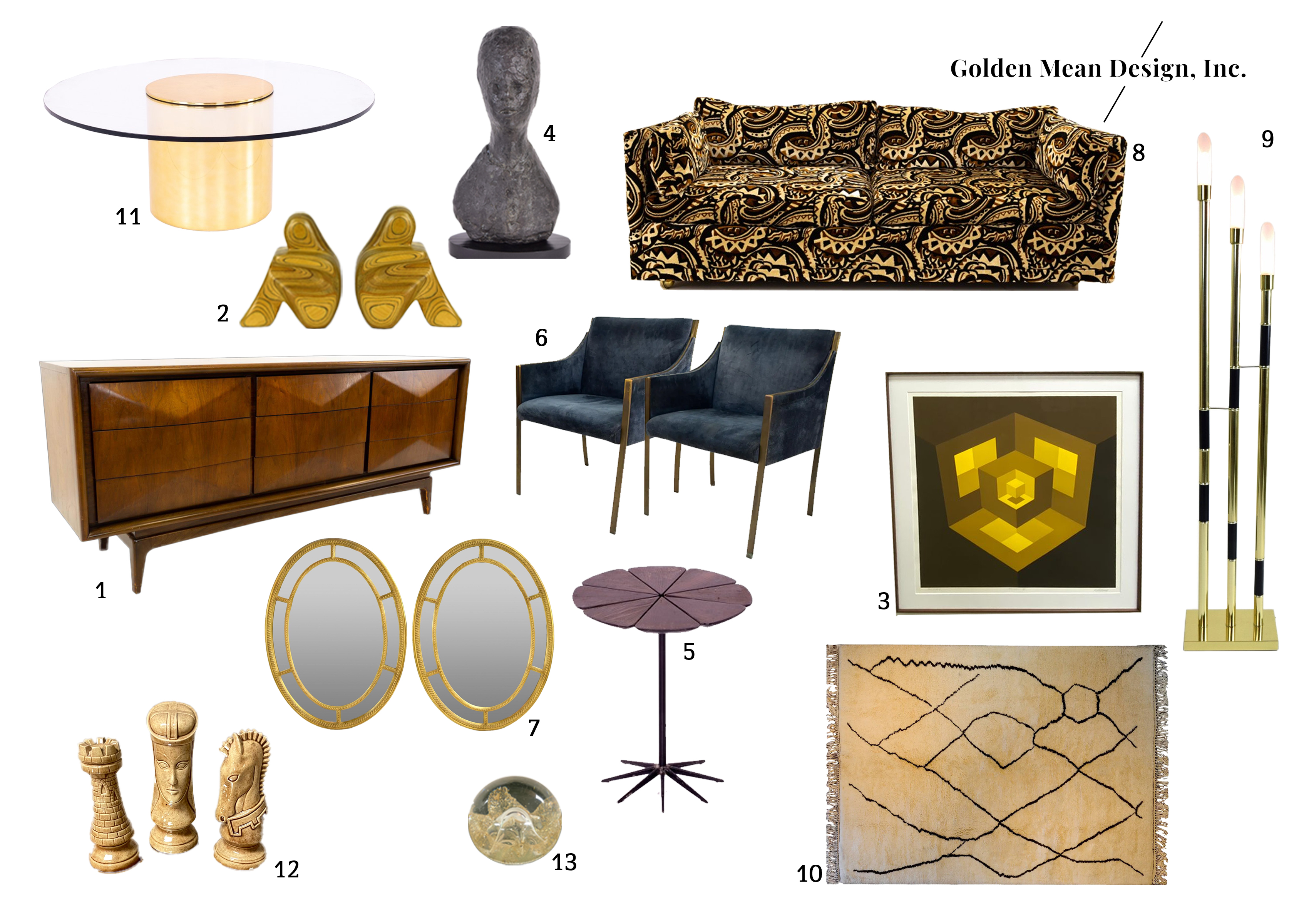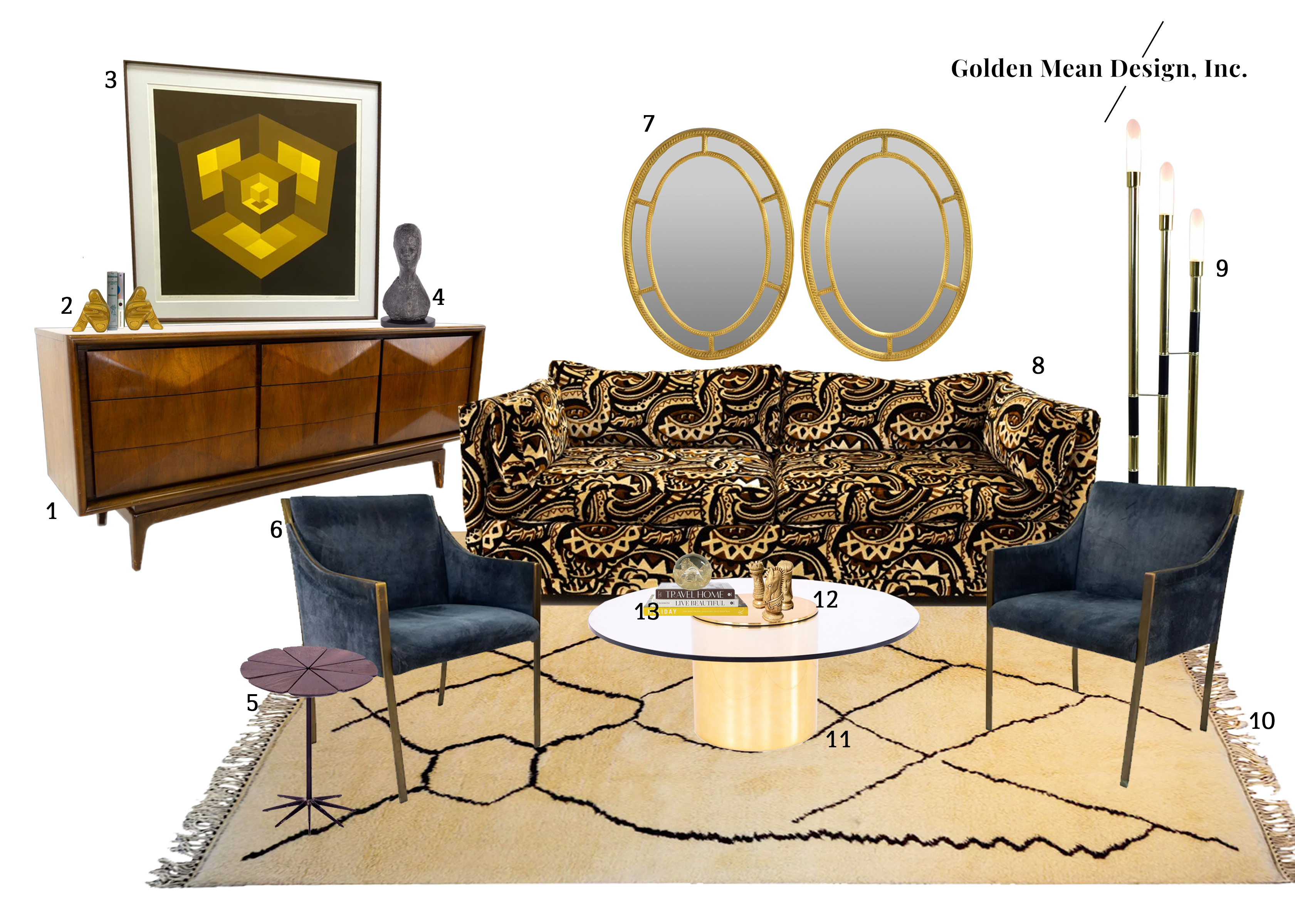Have you ever been seen a striking piece of furniture and thought, I love this but I just can't picture how the rest of the room could be built around it? I came across this sofa with original vintage fabric and fell in love with the pattern. To create a room around it, I decided to surround it with a neutral palette that really lets the sofa shine. A few brass accents bring out the gold tones in the upholstery without overwhelming it. The great geometric art piece sits off to the side instead of over the sofa, where I placed a pair of mirrors that frame the space while letting the sofa really steal the show. Don't be shy when shopping for key pieces! It's just a matter of balancing scale of pattern and materials.