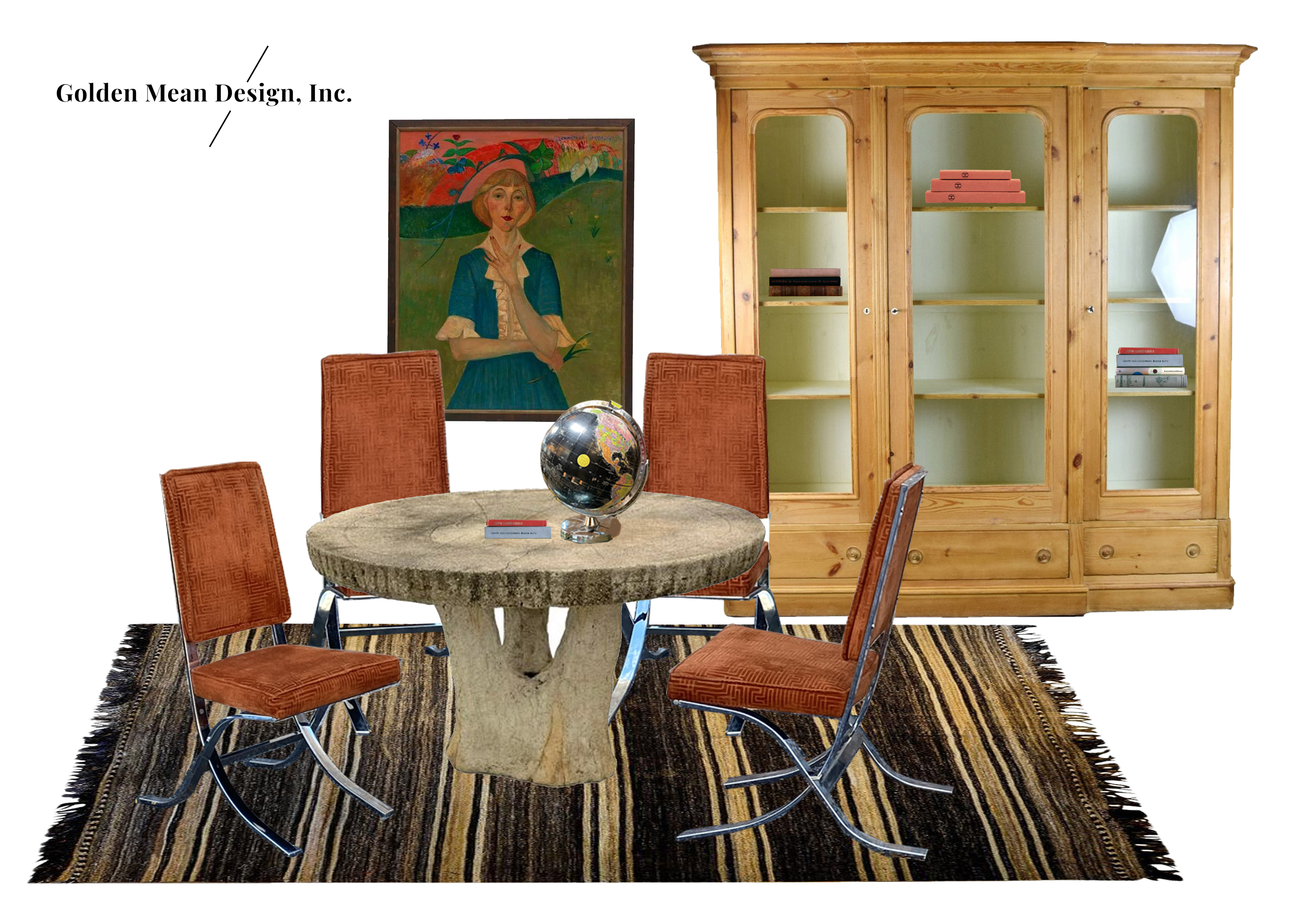 Here's the second of the dining spaces series. These chairs make my knees weak! I love the contrast between faux bois and chic, curvy chrome. The jewel tones of the large art give it such a richness and the honey tones of the armoire keep it from overwhelming the space. I wanted to create a more informal, multi-use dining space that could perhaps double as a comfortable place to work as well. Perhaps the armoire has baskets for office supplies, maybe even a printer? I want to just jump in and hang out.